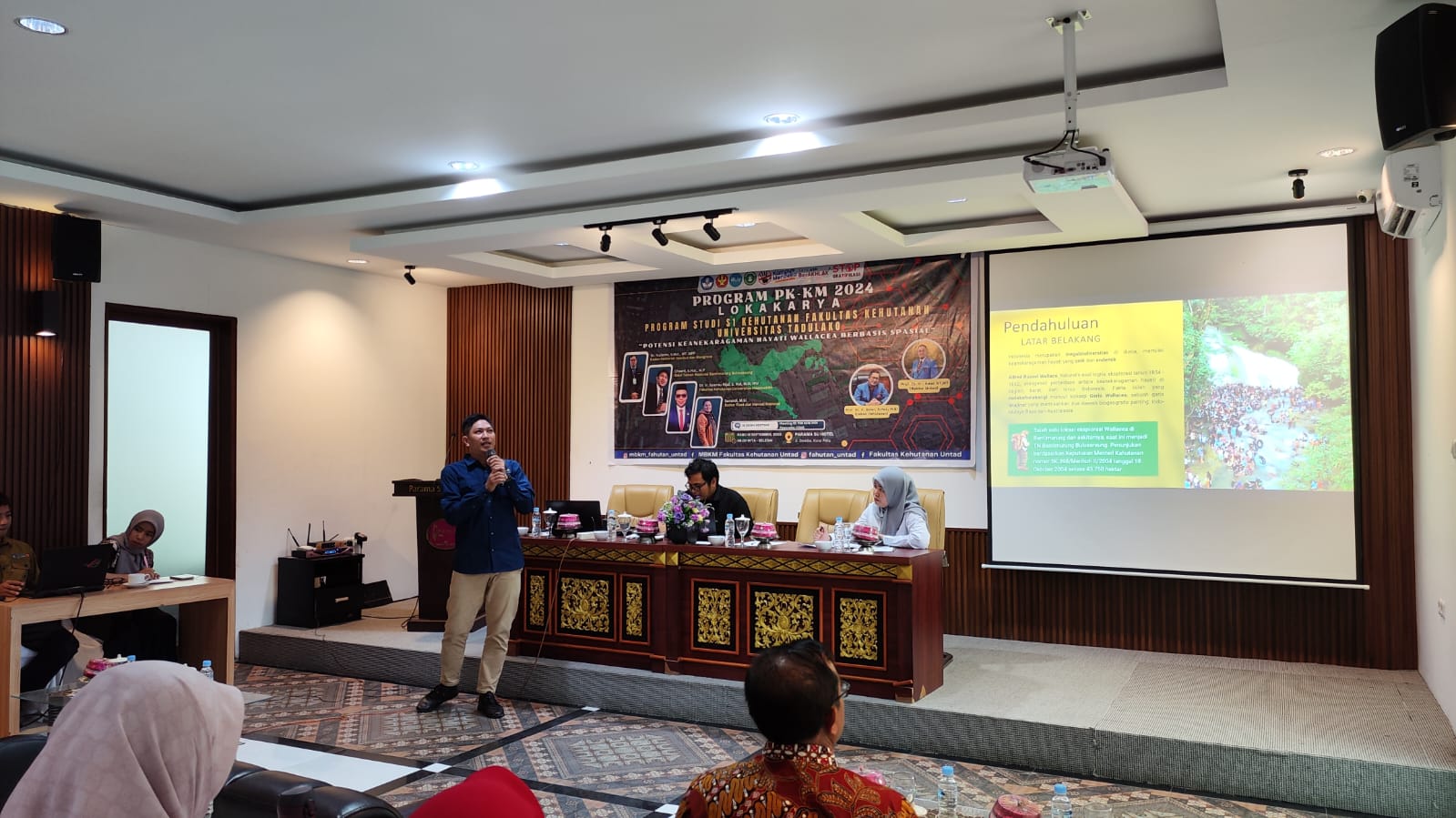pembukaan kegiatan pertama sambutan dari Koordinator Program Studi Kehutanan Dr. Ir. Abdul Rosyid, M.Si. dalam sambutannya beliau menyampaikan kegiatan ini perlu dilakukan untuk mendukung penguatan wilayah Wallacea. selanjutnya kegiatan dibuka oleh Dekan Fakultas Kehutanan Prof. Dr. Golar, S.Hut., M.Si.. Dalam sambutannya dekan fakultas kehutanan mengharapkan kegiatan ini tidak hanya peningkatan kapanilitas dan kompetensi mahasiswa namun juga di harapkan kegiatan PK-KM 2024 mampu meningkatkan informasi dosen tentang wallacea.